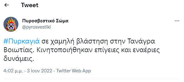 Από άγνωστη αιτία εκδηλώθηκε πυρκαγιά σε περιοχή με χαμηλή βλάστηση στην Τανάγρα Βοιωτίας, λίγο πριν τις 4 το απόγευμα της Παρασκευής 3 Ιουνίου.