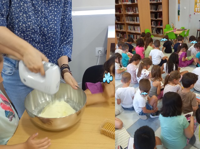Ακολούθησε βιωματική προσέγγιση με τους μικρούς μαθητές να αναλαμβάνουν ρόλο ζαχαροπλάστη και να ετοιμάζουν όλοι μαζί ένα «μπισκοτόγλυκο», το οποίο στη συνέχεια το απόλαυσαν.»