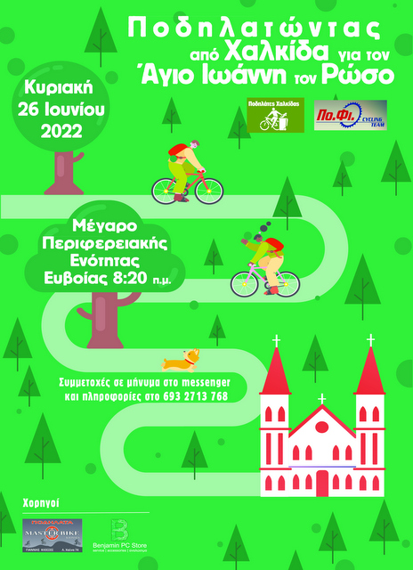 Οι Ποδηλάτες Χαλκίδας διοργανώνουν την Κυριακή 26 Ιουνίου, ποδηλατική εκδρομή στον Άγιο Ιωάννη τον Ρώσσο, με αφετηρία από το Μέγαρο thw Περιφερειακής Ενότητας Εύβοιας, στις 8:20 το πρωί.