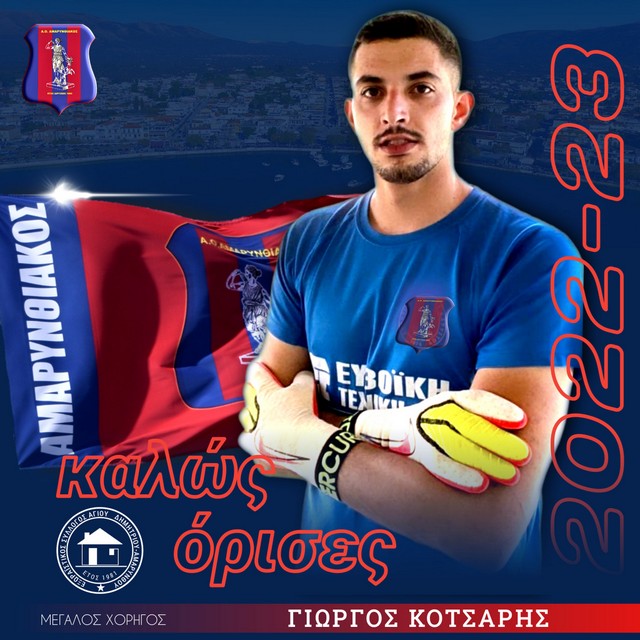"Η Διοίκηση του ΑΟ Αμαρυνθιακός ανακοινώνει την έναρξη της συνεργασίας με τον Γιώργο Κότσαρη. Γεννημένος το 1994 αγωνίζεται ως τερματοφύλακας.