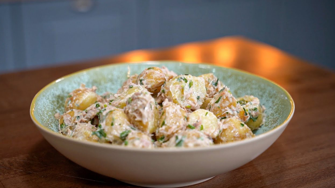 Ψιλοκόβουμε λίγο μαϊντανό και σχοινόπρασο και τα ρίχνουμε μέσα στο μπολ. Σουρώνουμε την κονσέρβα και προσθέτουμε τον τόνο στο μπολ με τα υπόλοιπα υλικά. Ανακατεύουμε και σερβίρουμε.