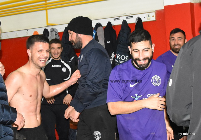 Ο Μορφούλης (δεξιά) χαμογελαστός στα αποδυτήρια του Σταδίου Χαλκίδας μετά τη φετινή νίκη (1-2) του Απόλλωνα επί του ΑΟ Χαλκίς.