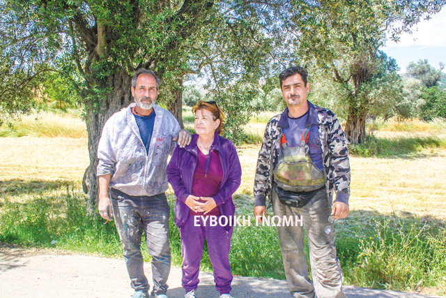 Ο Κωστής και ο Βασίλης Κοκορίκος μαζί με την Ζωή Λιβανίου, ποζάρουν με φόντο τα ξεραμένα χωράφια του Ληλαντίου, που κάποτε ήταν γεμάτα δέντρα και αμπέλια.
