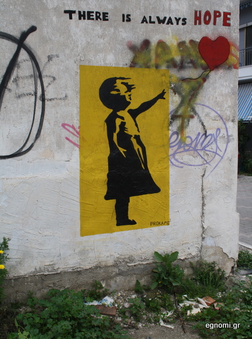 Το παιδάκι, η καρδιά και το σύνθημα στα αγγλικά, που μεταφρασμένο στα ελληνικά σημαίνει: Πάντα υπάρχει ελπίδα. Αυτή είναι η σύνθεση στον τοίχο της οδού Χριστοδούλου, που τη χαλάνε μόνο κάτι μουντζούρες, προφανώς από άλλους γκραφίστες.