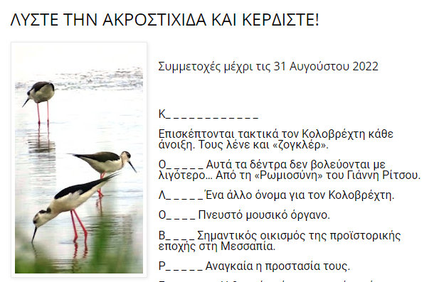 Η Ομάδα πολιτών για την διάσωση του υγροβιότοπου του Κολοβρέχτη διενεργεί διαγωνισμό με τίτλο "Λύστε την Ακροστιχίδα και Κερδίστε", με δώρα για τους νικητές και προθεσμία για την συμμετοχή μέχρι τις 31 Αυγούστου.