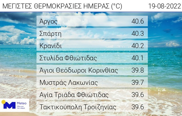Σημειώνεται ότι σε περισσότερους από 130 σταθμούς του δικτύου του meteo.gr η μέγιστη θερμοκρασία ξεπέρασε τους 37 βαθμούς.