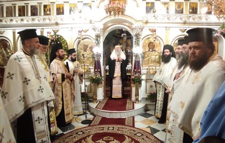 Στον πανηγυρίζοντα Ενοριακό Ιερό Ναό του Μαντουδίου, την παραμονή χοροστάτησε κατά τον Μεγάλο Εσπερινό ο Μητροπολίτης Χαλκίδος κ. Χρυσόστομος, πλαισιούμενος από πολλούς Κληρικούς, με επικεφαλής τον Ιεροκήρυκα Αρχιμ. Τιμόθεο Μπαϊμπάκη.