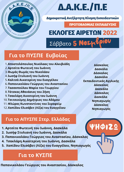 Η παράταξη της Δημοκρατικής Ανεξάρτητης Κίνησης Εκπαιδευτικών/Π. Ε. Ευβοίας ανακοίνωσε όλα τα ονόματα των υποψηφίων στις εκλογές, τα οποία μπορείτε να δείτε στον παρακάτω πίνακα:
