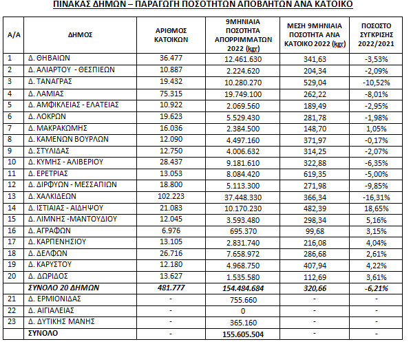 Η παραγωγή αποβλήτων ανά Δήμο και κάτοικο φαίνεται στον παρακάτω πίνακα: