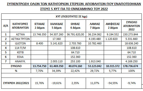 Η συνολική παραγωγή αστικών στερεών αποβλήτων των 20 Δήμων ανήλθε για το εννεάμηνο του 2022 σε 154.484.684 kgr και η συνολική ποσότητα όλων των κατηγοριών αποβλήτων ανήλθε σε 178.736.674 kgr.