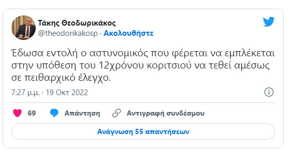 Την ίδια ώρα με εντολή του υπουργού Προστασίας του Πολίτη Τάκη Θεοδωρικάκου, ο αστυνομικός που φέρεται να εμπλέκεται στην υπόθεση του 12 χρόνου κοριτσιού τίθεται αμέσως σε πειθαρχικό έλεγχο.