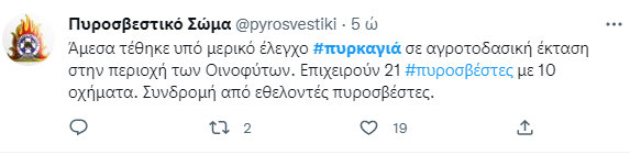 Πυρκαγιά εκδηλώθηκε σε αγροτοδασική έκταση της περιοχής Οινοφύτων, το μεσημέρι του Σαββάτου 29 Οκτωβρίου, με αποτέλεσμα να σημάνει συναγερμός στην Πυροσβεστική Υπηρεσία.