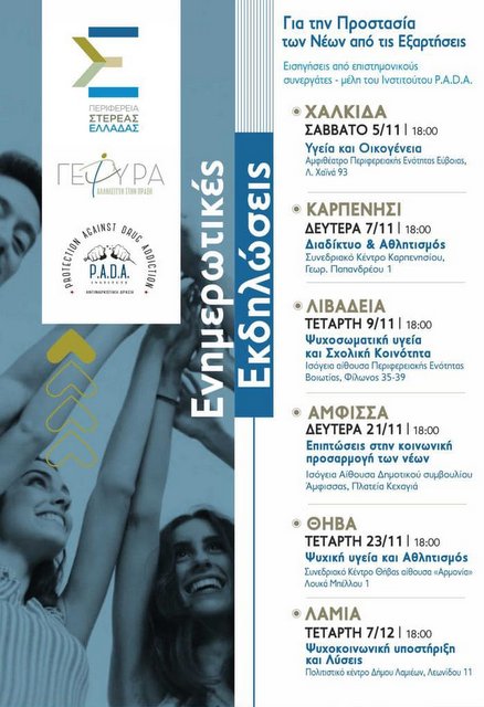 Ο Περιφερειάρχης Στερεάς Ελλάδας Φάνης Σπανός, ο Αντιπεριφερειάρχης Κοινωνικής Μέριμνας Ιωάννης Περγαντάς και ο Αντιστράτηγος ε.α. - Επίτιμος Υπαρχηγός της Ελληνικής Αστυνομίας και Πρόεδρος του Ινστιτούτου P.A.D.A. Αντιναρκωτική Δράση Γιάννης Ραχωβίτσας ανακοίνωσαν, την Δευτέρα 31 Οκτωβρίου, την υλοποίηση σειράς ενημερωτικών εκδηλώσεων για την προστασία των νέων από τις εξαρτήσεις.