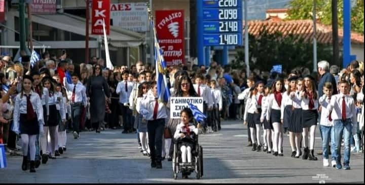 Παρέλασε για πρώτη φόρα με τη συνοδεία της εκπαιδευτικού ειδικής αγωγής, Αργυρώ Γιαλού.