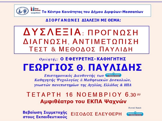 Tο Κέντρο Κοινότητας του Δήμου Διρφύων-Μεσσαπίων διοργανώνει διάλεξη, με θέμα “Δυσλεξία: Πρόγνωση, Διάγνωση, Αντιμετώπιση. Τεστ και Μέθοδος Παυλίδη”, που θα πραγματοποιηθεί την Τετάρτη 16 Νοεμβρίου, στις 6:30 το απόγευμα, στο Αμφιθέατρο του ΕΚΠΑ Ψαχνών.