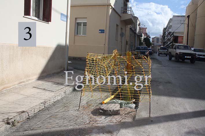 Παγίδα αποτελούν και τα ανοιχτά φρεάτια στην οδό Κατσικογιάννη, έξω από το 1ο Λύκειο (φωτό 3). Η προστασία για τους πεζούς είναι υποτειπώδης και μάλιστα σε ένα σημείο από το οποίο περνούν καθημερινά εκατοντάδες μαθητές.