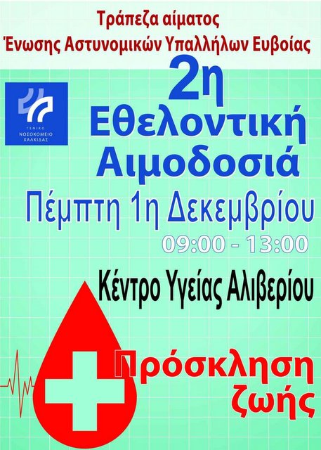 Η Ένωση Αστυνομικών Υπαλλήλων Ευβοίας διοργανώνει την 2η εθελοντική αιμοδοσία, προκειμένου να ενισχυθεί η Τράπεζα Αίματος της Ένωσης, η οποία θα πραγματοποιηθεί στο Αλιβέρι την Πέμπτη 1 Δεκεμβρίου.