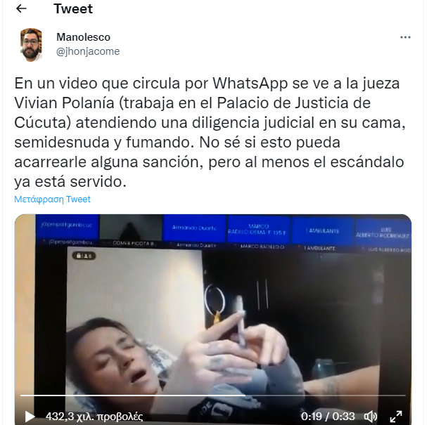 Μάλιστα η δικαστίνα ήταν ξαπλωμένη σε κρεβάτι και κάπνιζε. Η πειθαρχική επιτροπή της περιοχής Norte de Santander ανακοίνωσε ότι η δικαστής παραβίασε αρκετές κανονιστικές διατάξεις.