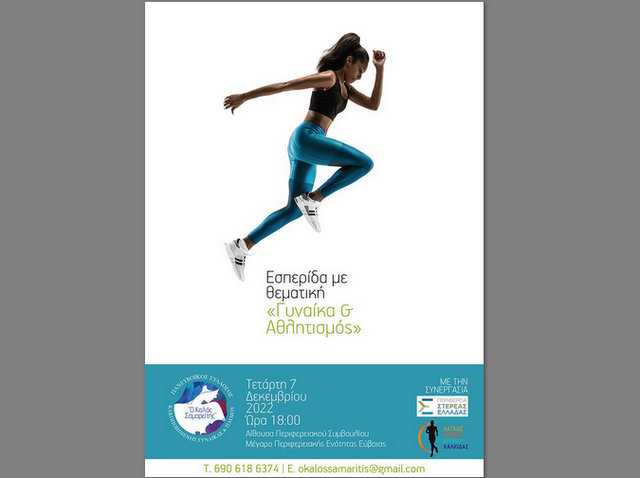 Συγκεκριμένα, θα πραγματοποιηθεί εσπερίδα με θεματική "Γυναίκα και Αθλητισμός", στην αίθουσα του Περιφερειακού Συμβουλίου, στο Μέγαρο Περιφερειακής Ενότητας Ευβοίας ( Λεωφόρος Χαϊνά), με είσοδο ελεύθερη για το κοινό.
