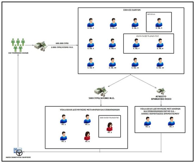 Όπως προέκυψε, πριν την εξέταση, κάθε υποψήφιος κατέβαλε -κατά μέσο όρο- το χρηματικό ποσό των 2.000 ευρώ, γνωρίζοντας ότι μέρος αυτών και συγκεκριμένα 500 ευρώ, προορίζονταν για υπάλληλο της αρμόδιας Διεύθυνσης Μεταφορών και Επικοινωνιών. Τα υπόλοιπα μοιράζονταν ανάλογα με τον εκάστοτε ρόλο (ιδιοκτήτης σχολής, μεσολαβητής, διερμηνέας).