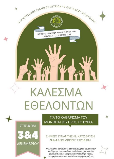 Με πρωτοβουλία του Πολιτιστικού Συλλόγου Πετριών "Ο Πλάτανος", θα πραγματοποιηθεί καθαρισμός από εθελοντές του μονοπατιού της περιοχής προς το Βύρο, το Σαββατοκύριακο 3-4 Δεκεμβρίου.
