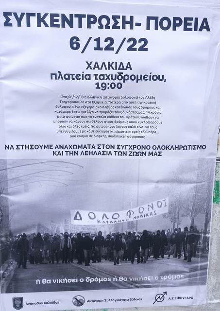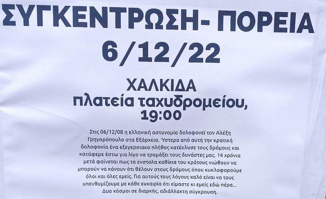 Οι συλλογικότητες " Ανάποδος Χαλκίδας", "Αυτόνομη Συλλογικότητα Εύβοιας" και "Α.Σ.Ε Φουγάρο" διοργανώνουν πορεία και συγκέντρωση στην πλατεία Δικαστηρίων (η ανακοίνωση την αναφέρει πλατεία Ταχυδρομείου), στη Χαλκίδα, για τη επέτειο του θανάτου του Αλέξη Γρηγορόπουλου.