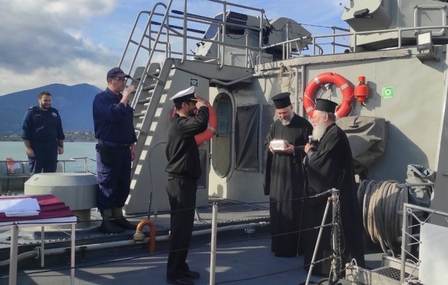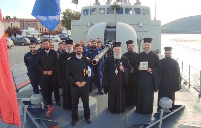 Ο Μητροπολίτης μετέφερε, προς ευλογία του πληρώματος, απότμημα εκ των ιερών λειψάνων του Αγίου Νικολάου και τέλεσε δέηση. Ο κυβερνήτης, Πλωτάρχης Γεώργιος Καρβούνης, ευχαρίστησε τον Σεβασμιώτατο και του προσέφερε, ως δώρο, τον θυρεό του σκάφους.