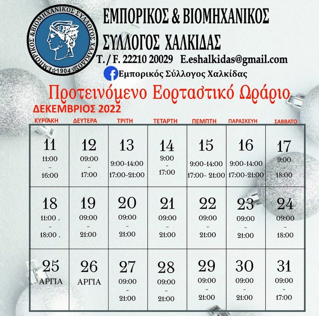 Δείτε στον πίνακα που ακολουθεί το εορταστικό ωράριο των καταστημάτων μέχρι την τελευταία μέρα του χρόνου. Την πρωτοχρονιά και την δεύτερη μέρα του χρόνου τα καταστήματα θα είναι κλειστά, ενώ από τις 3 Ιανουαρίου επανέρχονται στο κανονικό ωράριο λειτουργίας.