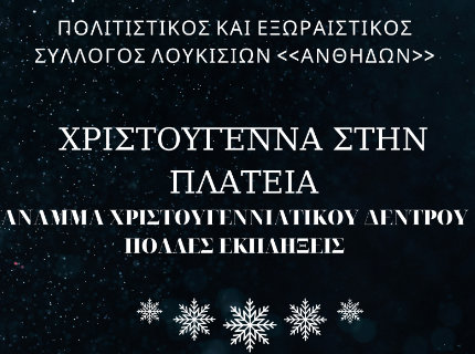 Ο Πολιτιστικός και Εξωραϊστικός Σύλλογος Λουκισίων «Ανθηδών» διοργανώνει εκδήλωση για το άναμμα του Χριστουγεννιάτικου δέντρου, το Σάββατο 17 Δεκεμβρίου, στις 5:30 το απόγευμα, στην πλατεία Ευάγγελου Ρούσση.