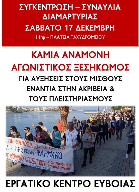 Στο πλαίσιο των αγωνιστικών κινητοποιήσεων και δράσεων για βελτίωση της καθημερινότητας και της ποιότητας ζωής, το Εργατικό Κέντρο Εύβοιας διοργανώνει συγκέντρωση διαμαρτυρίας και συναυλία, στην πλατεία Δικαστηρίων, στη Χαλκίδα, το Σάββατο 17 Δεκεμβρίου, στις 11 το πρωί.