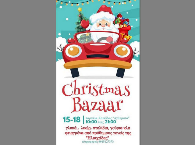 Από την Πέμπτη 15 Δεκεμβρίου έως την Κυριακή 18 Δεκεμβρίου, από τις 10 το πρωί μέχρι τις 9 το βράδυ, θα πραγματοποιηθεί το ετήσιο Χριστουγεννιάτικο Μπαζάρ του Συλλόγου ΑΜΕΑ "Ηλιαχτίδα" Χαλκίδας
