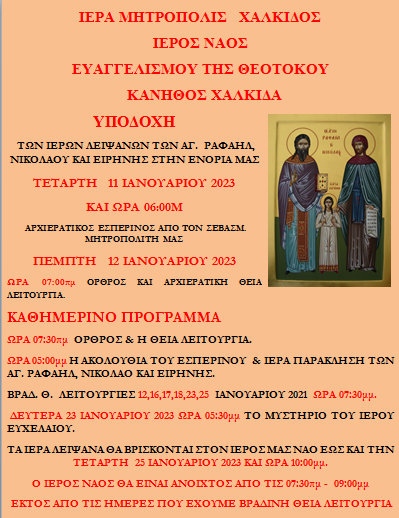 Τα Ιερά Λείψανα των Αγίων Μαρτύρων Ραφαήλ, Νικολάου και Ειρήνης από την νήσο Λέσβο έρχονται στη Χαλκίδα, την Τετάρτη 11 Ιανουαρίου και θα παραμείνουν για 15 μέρες στο ναό της Ευαγγελίστριας Κανήθου, όπου θα τελεστούν Ακολουθίες σύμφωνα προς το ακόλουθο πρόγραμμα.