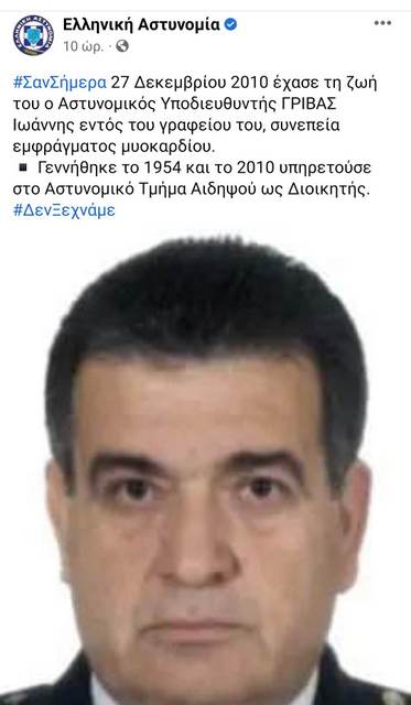 Σαν σήμερα, στις 27 Δεκεμβρίου 2010 έχασε τη ζωή του ο Αστυνομικός Υποδιευθυντής Ιωάννης Γρίβας, ενώ βρισκόταν μέσα στο γραφείο του, μετά από έμφραγμα του μυοκαρδίου, που υπέστη.