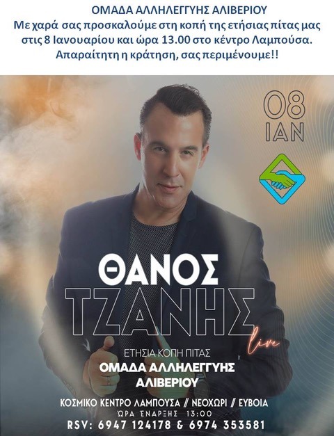 Η Ομάδα Αλληλεγγύης Αλιβερίου διοργανώνει εκδήλωση για την κοπή της πρωτοχρονιάτικης πίτας, την Κυριακή 8 Ιανουαρίου, στην 1 το μεσημέρι, στο κοσμικό κέντρο "Λαμπούσα", στο Νεοχώρι.