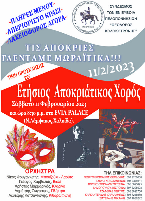 O Αποκριάτικος χορός του Συνδέσμου των εν Ευβοία Πελοποννησίων θα πραγματοποιηθεί το Σάββατο 11 Φεβρουαρίου, με ώρα έναρξης στις 8:30 το βράδυ, στο κέντρο "EVIA PALACE" στη Νέα Λάμψακο.
