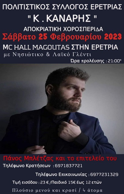Ο Πολιτιστικός Σύλλογος Ερέτριας "Κ. Κανάρης" θα πραγματοποιήσει αποκριάτικο χορό, το Σάββατο 25 Φεβρουαρίου, στις 9 το βράδυ, στο κοσμικό κέντρο "Μαγκούτας".