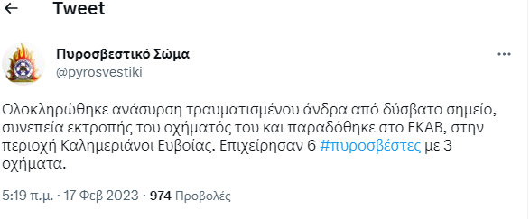 Στον τόπο του ατυχήματος επιχείρησαν τρία οχήματα της Πυροσβεστικής Υπηρεσίας, με έξι πυροσβέστες, οι οποίοι κατάφεραν να ανασύρουν από δύσβατο σημείο τον 22χρονο, ο οποίος είχε τραυματιστεί ελαφρά.