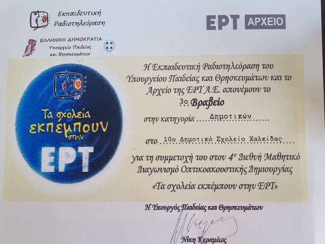 Οι εκπαιδευτικοί του 10ου Δημοτικού Σχολείου Χαλκίδας συμμετείχαν στην τελετή βράβευσης του 2ου, 3ου και 4ου Διεθνούς Μαθητικού Διαγωνισμού Οπτικοακουστικής Δημιουργίας: «Τα Σχολεία εκπέμπουν στην ΕΡΤ».