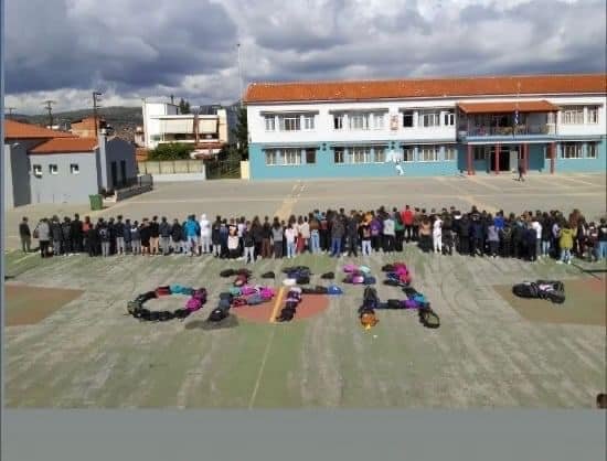 Ανάλογη δράση έκαναν και οι μαθητές του Γυμνασίου Ψαχνών. Στο δικό τους προαύλιο και με τις δικές τους τσάντες έγραψαν το μήνυμα «Οργή» και την ημερομηνία της τραγωδίας (φωτό κάτω).