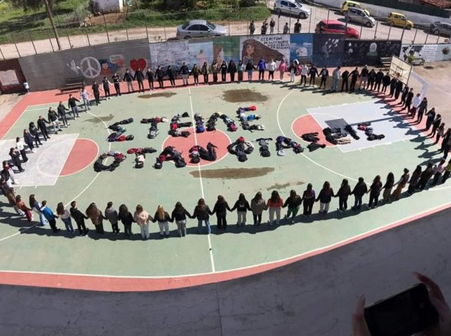 Τα λυκειόπαιδα από την Αμάρυνθο σχημάτισαν στο προαύλιο του σχολείου το μήνυμα «Στείλε όταν φτάσεις» χρησιμοποιώντας τις σχολικές τους τσάντες και γύρω από αυτό δημιούργησαν μια ανθρώπινη αλυσίδα (φωτό πάνω δεξιά).