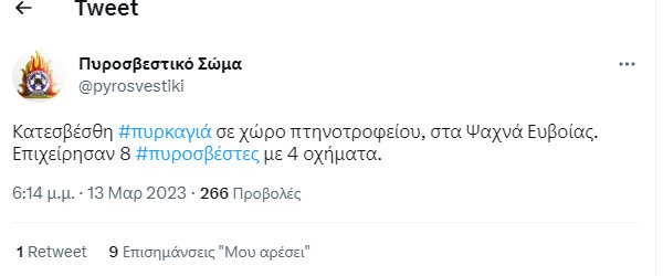 Στις φλόγες τυλίχθηκε πτηνοτροφείο, στην περιοχή των Ψαχνών, του Δήμου Διρφύων-Μεσσαπίων. Η φωτιά ξεκίνησε περίπου στις 2 παρά 10 το μεσημέρι της Δευτέρας 13 Μαρτίου από άχυρα και επεκτάθηκε στο χώρο της επιχείρησης.