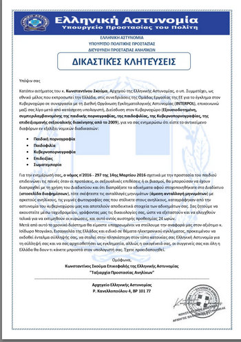 Στο πλαίσιο αυτό ανακοινώνεται ότι, το παρακάτω κείμενο – μήνυμα που διακινείται μέσω ηλεκτρονικού ταχυδρομείου (email), ως δήθεν επιστολή του Αρχηγού της Ελληνικής Αστυνομίας, Αντιστράτηγου Κωνσταντίνου Σκούμα, η οποία φέρει το ονοματεπώνυμό του, καθώς και ψευδή υπογραφή και σφραγίδα με επιγραφή «Ελληνική Δημοκρατία – Ελληνική Αστυνομία» είναι καταφανώς ψευδεπίγραφο και απατηλό και αποστέλλεται από δράστες που επιχειρούν προφανώς να εξαπατήσουν – παραπλανήσουν τους πολίτες.
