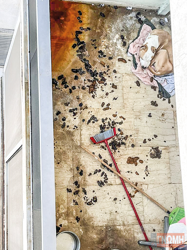Αποτέλεσμα είναι το μπαλκόνι να έχει καλυφθεί από κόπρανα (φωτό) και να αποτελεί υγειονομική βόμβα για τους ίδιους, το βρέφος τους, αλλά και το τετράποδο ζωάκι, το οποίο ζει μέσα σε μια βρομερή κόλαση.