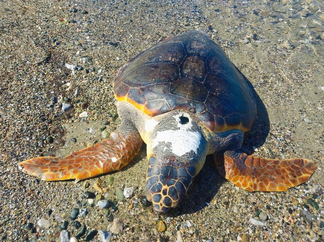 Θαλάσσια χελώνα επέπλεε νεκρή στη θαλάσσια περιοχή της πλαζ "Κουρέντι", στη Χαλκίδα. Είχε ένα χτύπημα στο κεφάλι, που οδηγεί στο συμπέρασμα ότι χτυπήθηκε πιθανότατα από καμάκι.