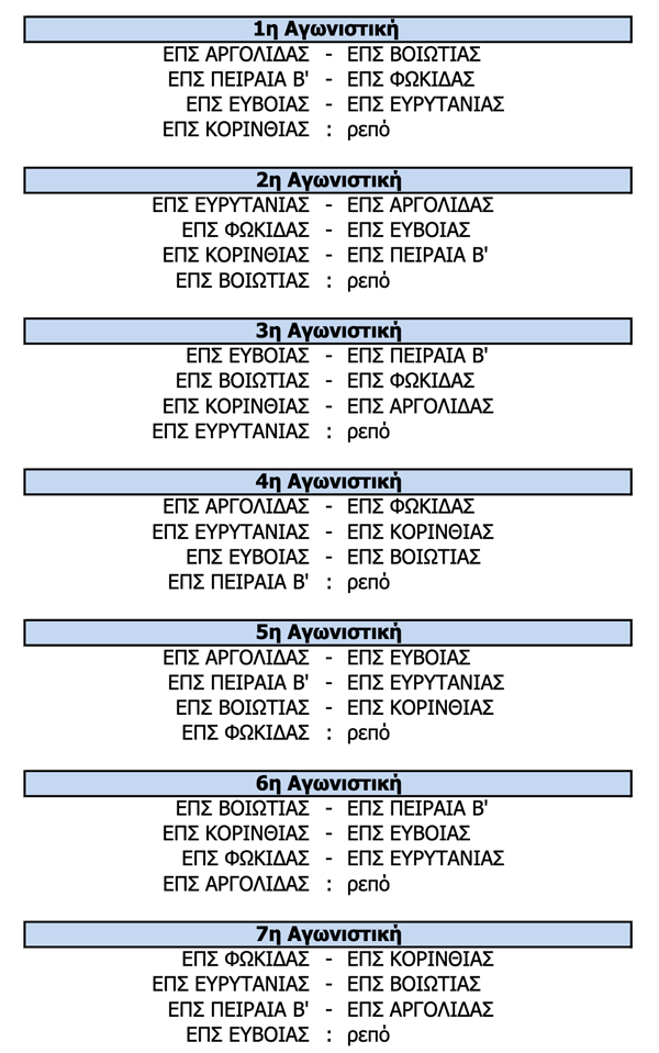 Εκτός έδρας θ' αγωνιστεί με την Φωκίδα αρχικά και σε δυο διαδοχικές αγωνιστικές, πριν το ρεπό της στην τελευταία αγωνιστική, με τις πρωταθλήτριες Αργολίδας και Κορίνθου.