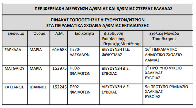 Από την Περιφερειακή Διεύθυνση Πρωτοβάθμιας και Δευτεροβάθμιας Εκπαίδευσης Στερεάς Ελλάδας ανακοινώθηκε η τοποθέτηση εκπαιδευτικών σε θέσεις Διευθυντών/ντριών στα Πρότυπα Σχολεία (Π.Σ.) και Πειραματικά Σχολεία (ΠΕΙ.Σ.) της Στερεάς Ελλάδας.