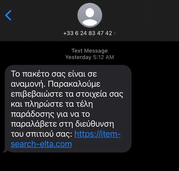 «Το πακέτο σας είναι σε αναμονή. Παρακαλούμε επιβεβαιώστε τα στοιχεία και πληρώστε τα τέλη παράδοσης για να το παραλάβετε στη διεύθυνση του σπιτιού σας», αναφέρεται χαρακτηριστικά στο μήνυμα-απάτη.