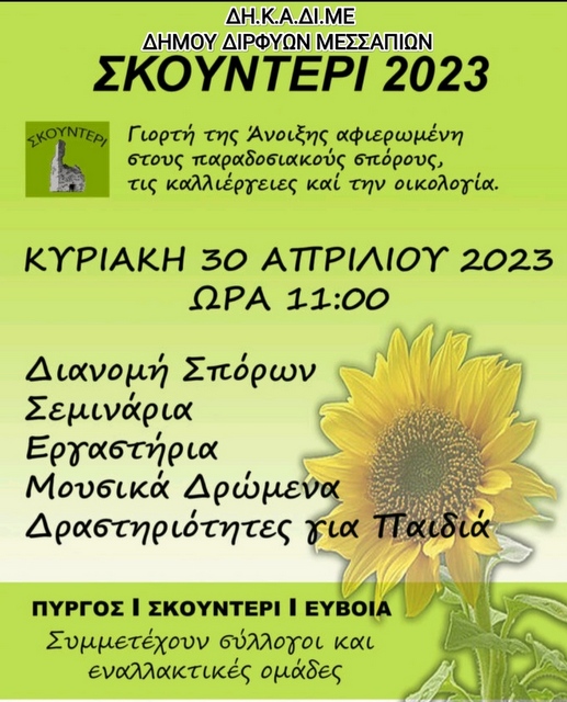 Η ΔΗ.Κ.Α.ΔΙ.ΜΕ. του Δήμου Διρφύων Μεσσαπίων, με τη συμμετοχή συλλόγων και εναλλακτικών ομάδων, θα πραγματοποιήσουν την "Γιορτή της Άνοιξης", την Κυριακή 30 Απριλίου, με ώρα έναρξης στις 11 το πρωί, στον πύργο στο Σκουντέρι (φωτό κάτω).