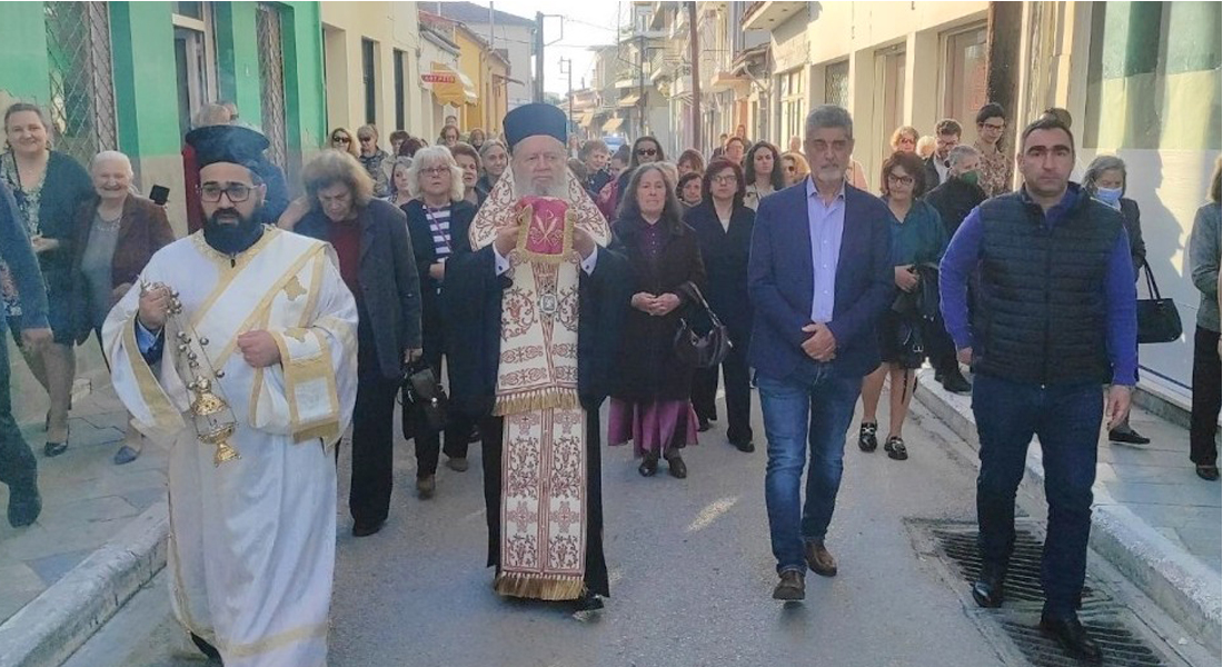 Έπειτα όλοι σχημάτισαν πομπή προς την κεντρική πλατεία της Ιστιαίας, όπου στο μνημείο Ηρώων ο Σεβασμιώτατος τέλεσε επιμνημόσυνη Δέηση και ακολούθησε κατάθεση στεφάνων.
