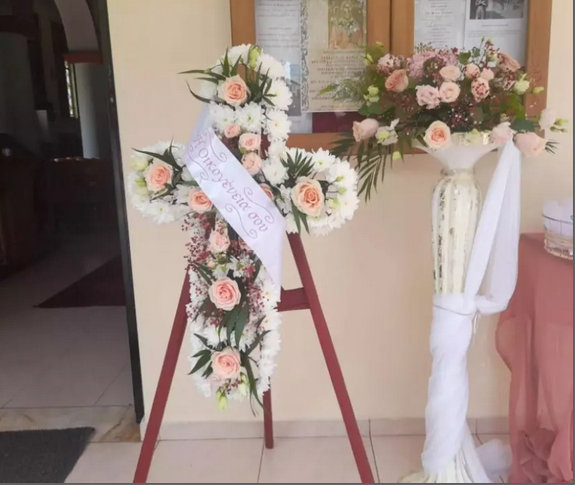 Δίπλα στο τραπέζι με τις μπομπονιέρες και τα γλυκά είχε τοποθετηθεί ένας σταυρός από λευκά λουλούδια από την οικογένεια του βρέφους ενώ αρκετοί ήταν και αυτοί που έστειλαν στεφάνια.